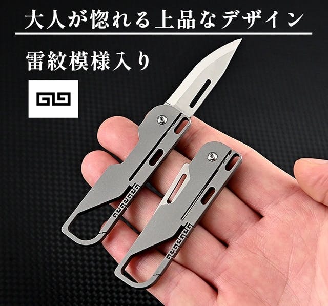 雷紋模様入りキーホルダーがついているので、アウトドアだけでなく室内でも使える、コンパクトなのに切れ味バツグンなミニナイフが登場しました!