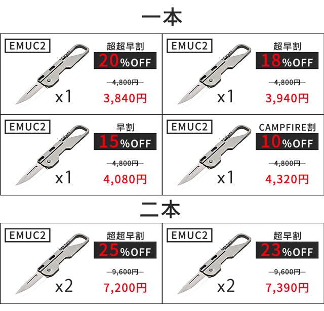 2024/11/22 18:20皆様こんばんは。株式会社Emu-One の工藤です。弊社の新規プロジェクトをご紹介いたします。 片手で一秒開閉!純チタン製キャロットナイフで大人にも夢中になれる、実用性も抜群↓プロジェクトページはコチラ↓https://camp-fire.jp/projects/811595/preview11月23日(土)18時よりCampfireにて予約販売を開始いたします。特徴:❶ 毎日使いに最適な純チタン製でミニマムサイズで切れ味も抜群。❷ 手首を軽く動かし、重力を少し加えて遊ぶキャロットナイフは、手先の運動や気分転換に最適。❸ わずか38gの軽さと折りたたみ式で持ち運び便利。いつでもサッと取り出して使える。ぜひ、一度プロジェクトページをチェックしていただければ幸いです。 片手で簡単に刃の開閉ができ、頑丈かつ軽量で、しかも切れ味抜群です。「EMUC5」は手のひらサイズで持ち運びやすく、段ボールの解体や釣り、キャンプでも大活躍!普段の生活からアウトドアまで幅広く使える万能ミニナイフです。↓プロジェクトページはコチラ↓https://camp-fire.jp/projects/811595/preview皆様の応援&ご支援心よりお待ちしております。 もっと見るチタンボディナイフ「EMUC2」/全ての商品の発送が完了