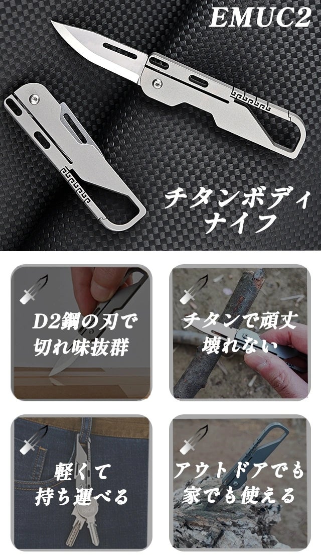 切れ味を追求したチタンボディナイフ「EMUC2」は、あらゆる「切る」シーンに対応します。
