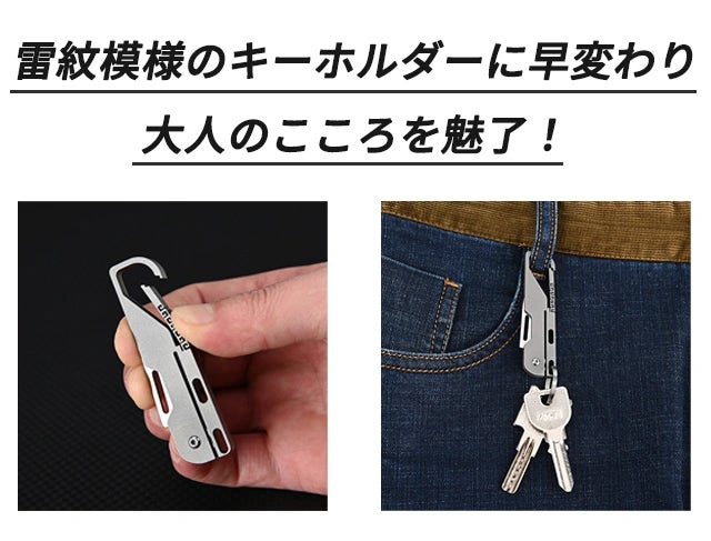 雷紋模様入りキーホルダーがついているので、アウトドアだけでなく室内でも使える、コンパクトなのに切れ味バツグンなミニナイフが登場しました!