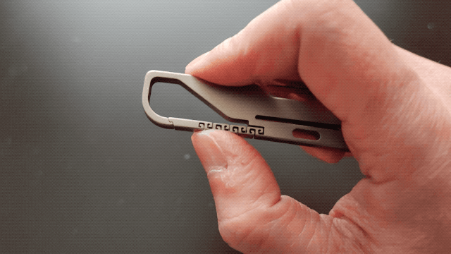 雷紋模様が特徴的な持ち手はカラビナのような構造になってます。