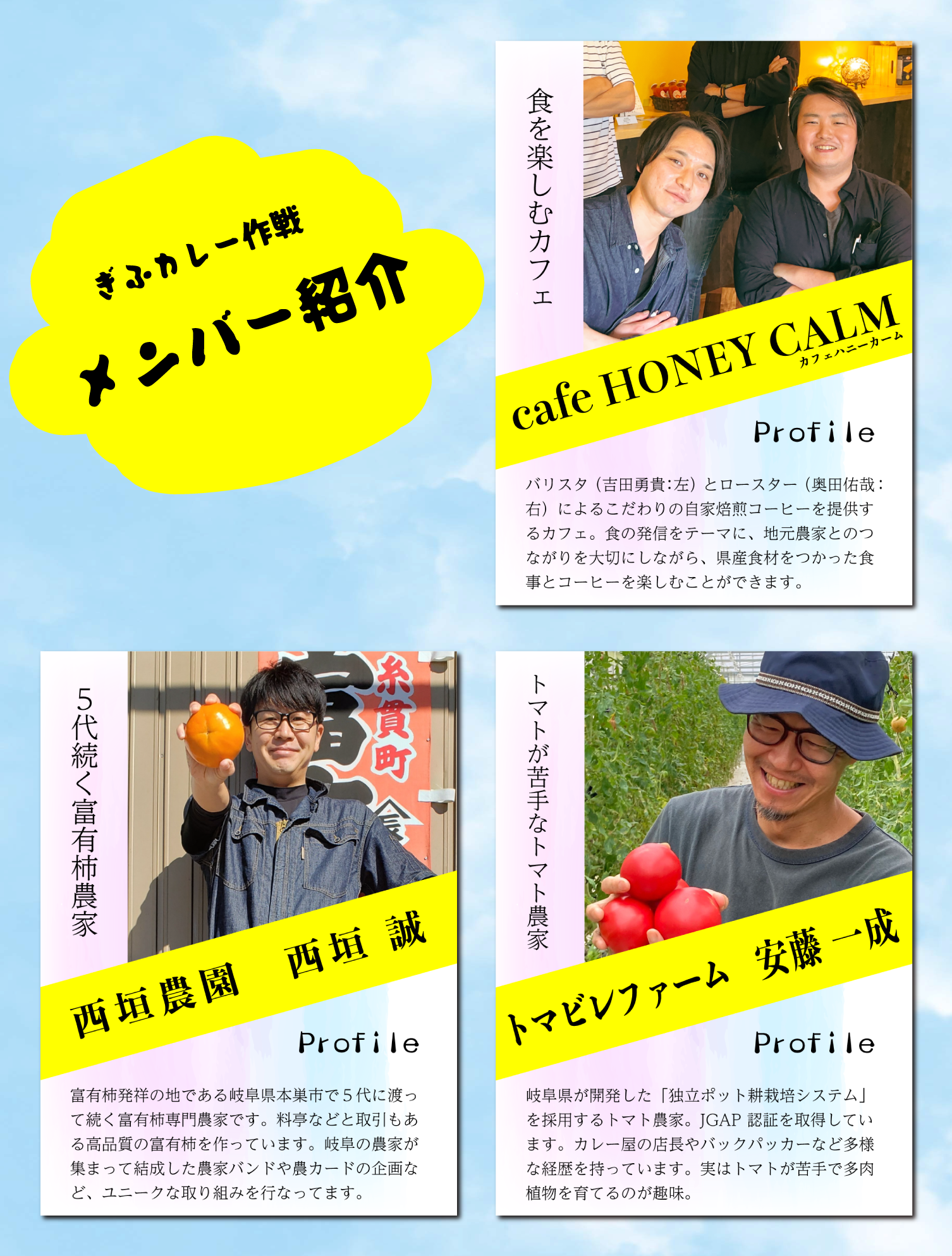 カフェで人気の味を元に、岐阜の農産物を使った「ぎふを楽しむカレー」のコンセプトが決定。cafe HONEY CALMと富有柿専門農家「西垣農園」、そしてカレーに欠かせないトマトを生産する「トマビレファーム」による「ぎふカレープロジェクト」チームが結成されました。