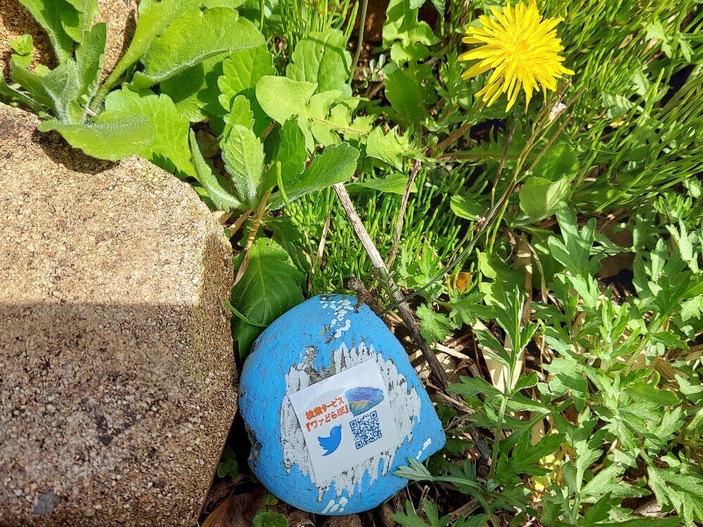 写真は春先に撮りましたタンポポと石絵のショットです。