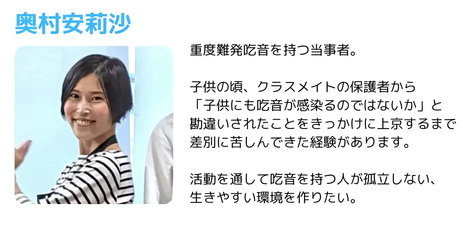 発起人の奥村さんはこの調査の中で吃音を持つ人が生きやすい社会をつくるには、世間の理解・認知向上が不可欠だと確信して、この活動をはじめられました。