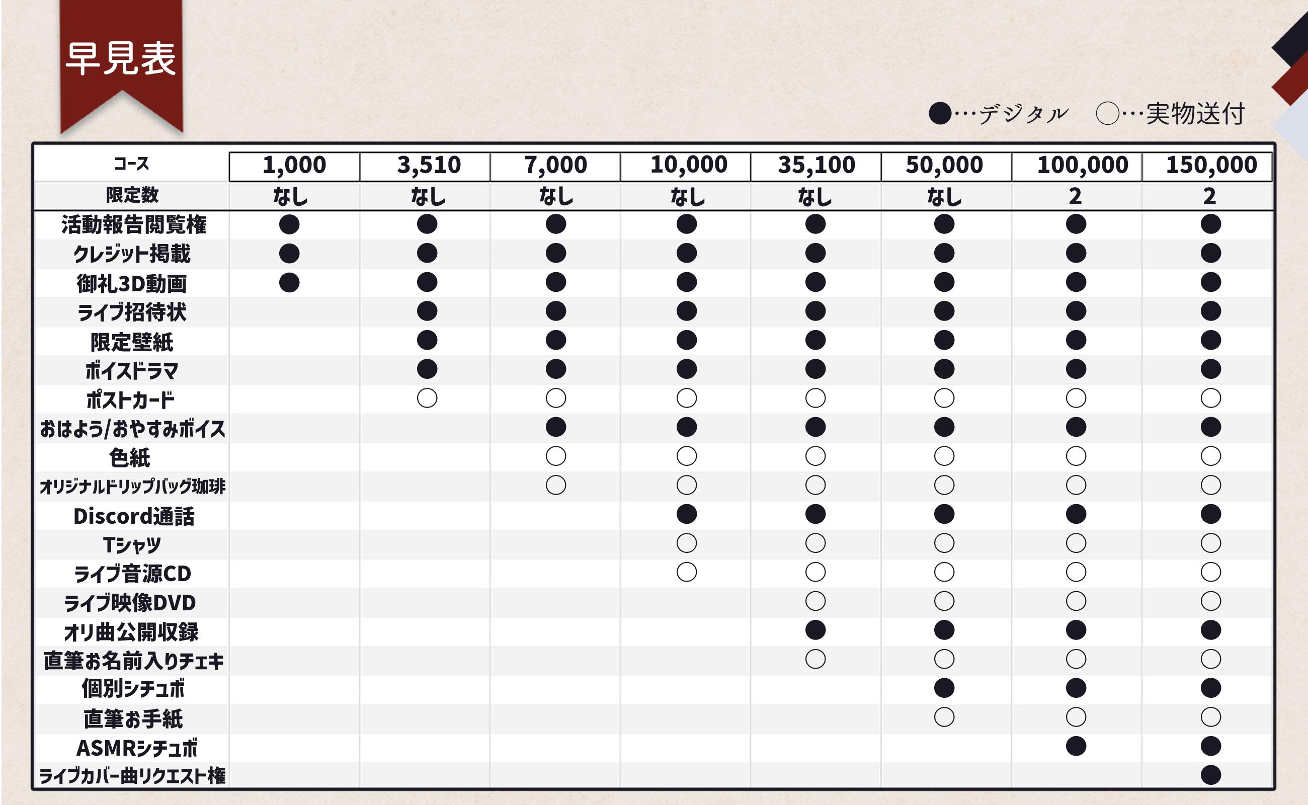 3Dライブ後に開催されるご支援者様の限定二次会ライブでのカバー楽曲リクエスト権です。