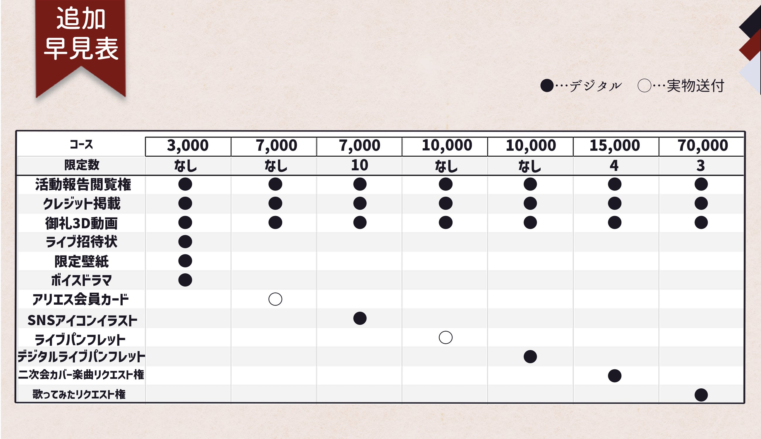 3Dライブ後に開催されるご支援者様の限定二次会ライブでのカバー楽曲リクエスト権です。
