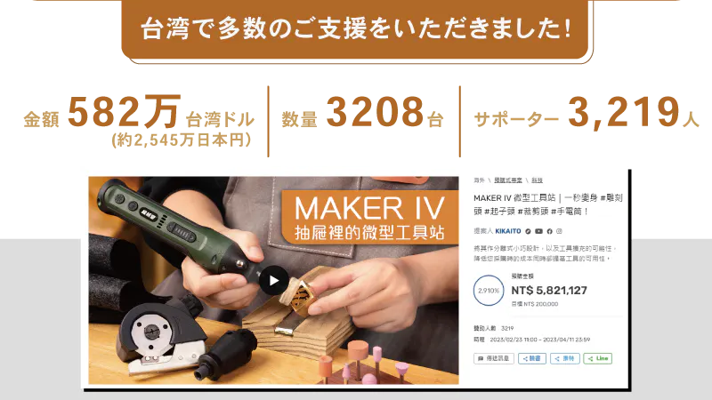 リターン品の配送が完了するまで、株式会社楽京は台湾発のブランド「KiKAiTO」の製品「MAKER IVペン型マルチ電動工具」の日本における独占販売権を有する正規代理店です。