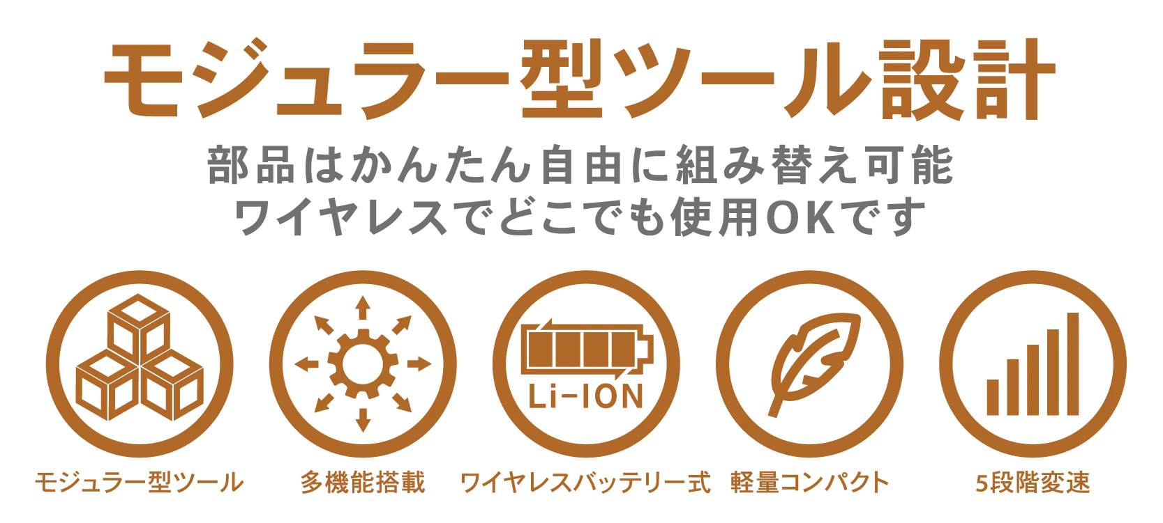 部品を自由に組み替えられるモジュラー型設計により、グラインダー、ドライバー、電動カッター、今後開発予定の拡張工具など、都度必要なパーツを装着できます。