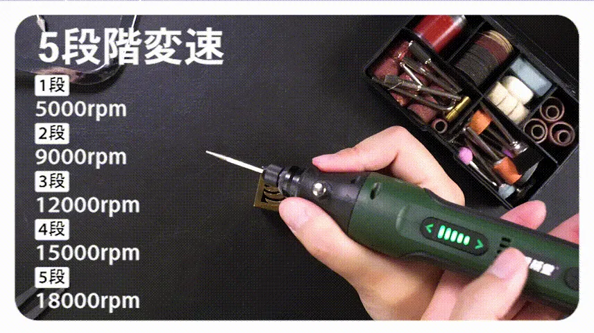 A:ドライバーとカッターの速度は固定となります。グラインダーのみ5段階変速が使用可能です。