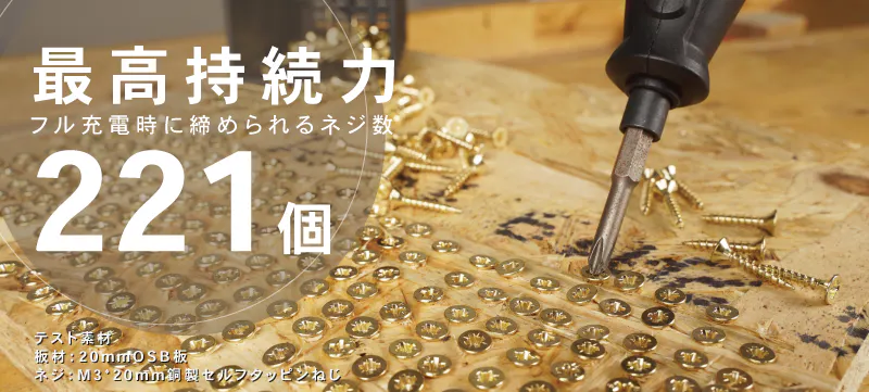 ▲1度の充電でハイパフォーマンス (使用状況によってことなります。)フル充電時には221個のネジを締めることが可能です。充電が切れるまでの間、ネジ締めの度合いを均一に維持します。屋外でも頻繁に充電する必要がなく、効率よく作業が進められます。