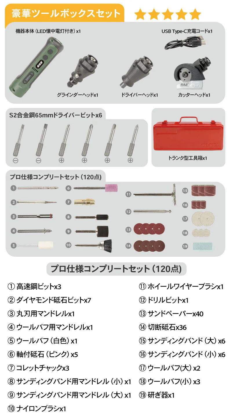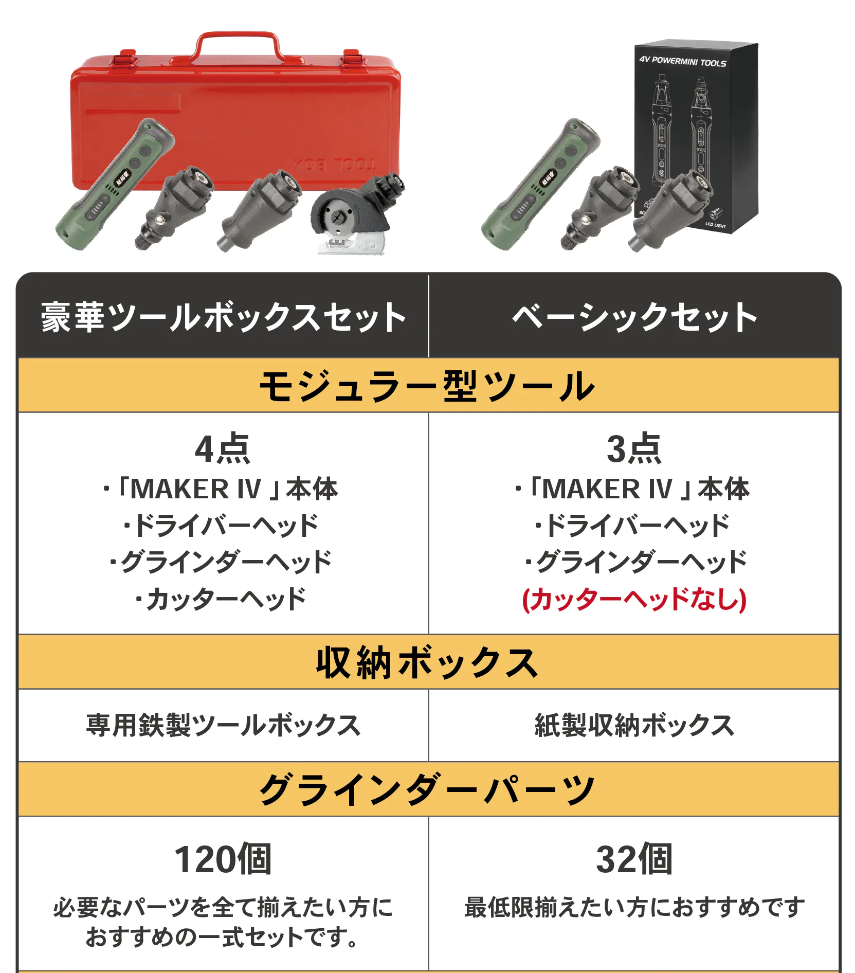 グラインダーヘッド・ドライバーヘッド・カッターヘッドの3点は豪華ツールボックス付きセットに付属します。