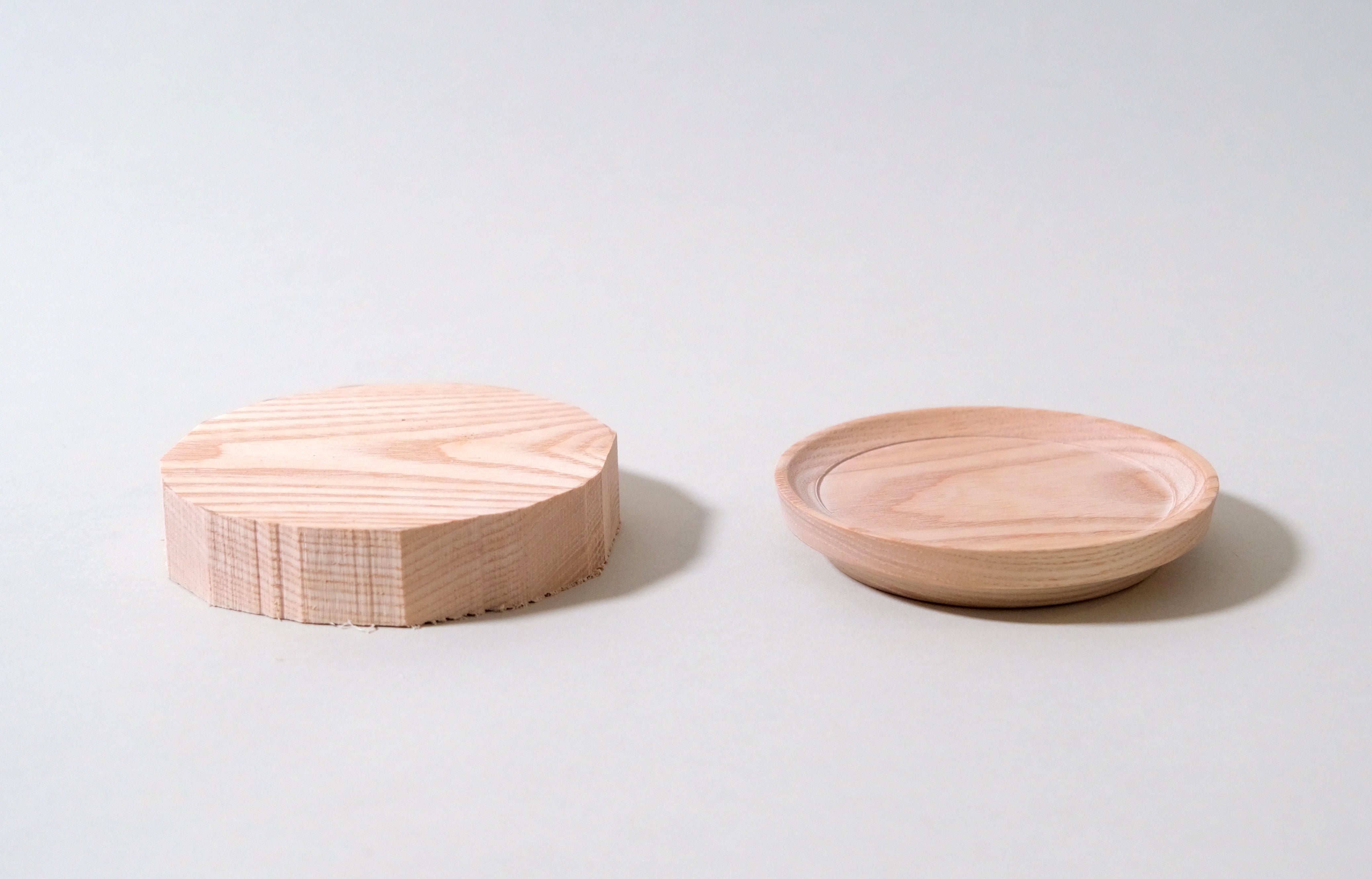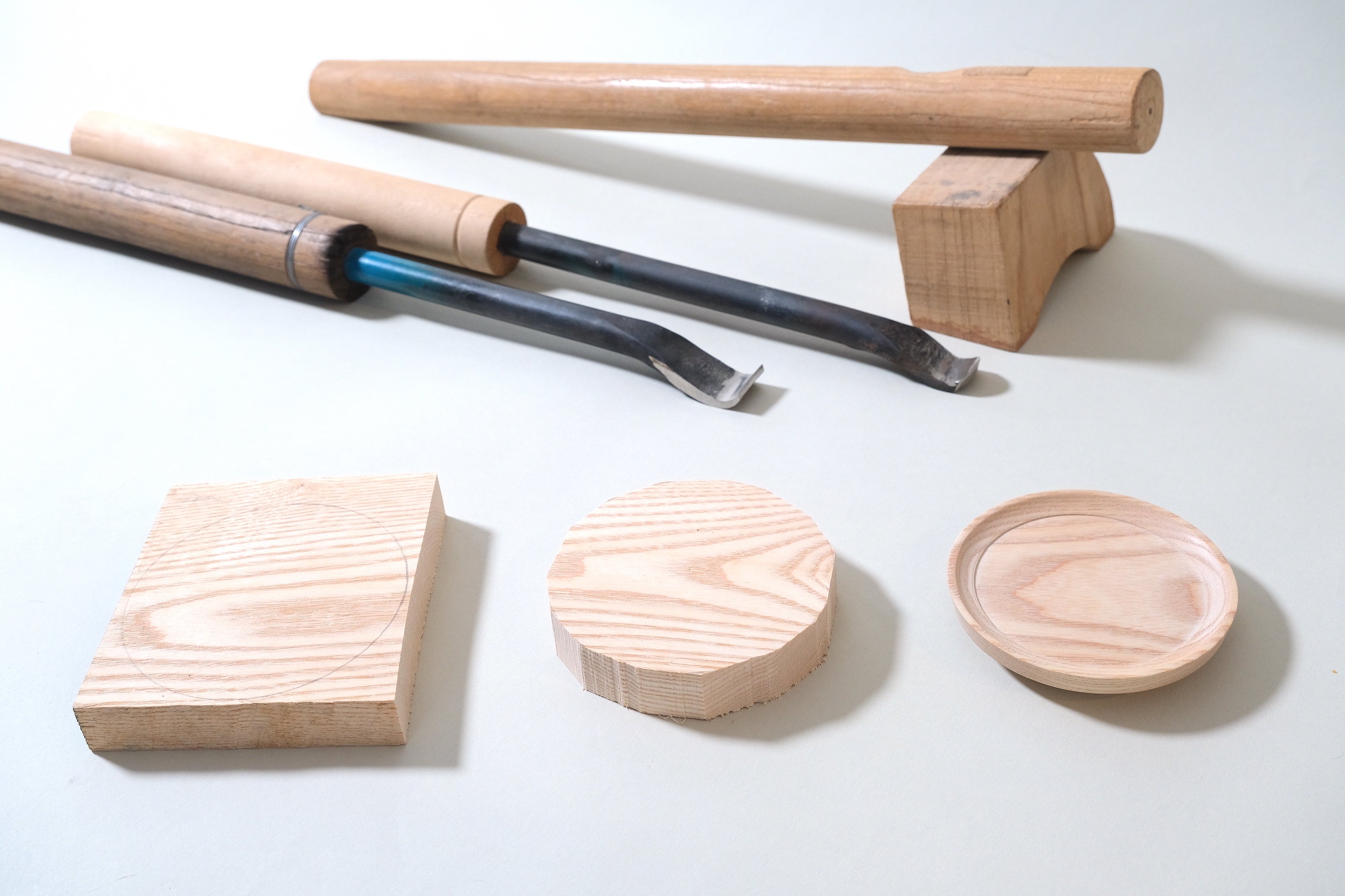 木材を回転させて削り出す体験を通じて、オリジナルのコースター(小皿)を制作します。
