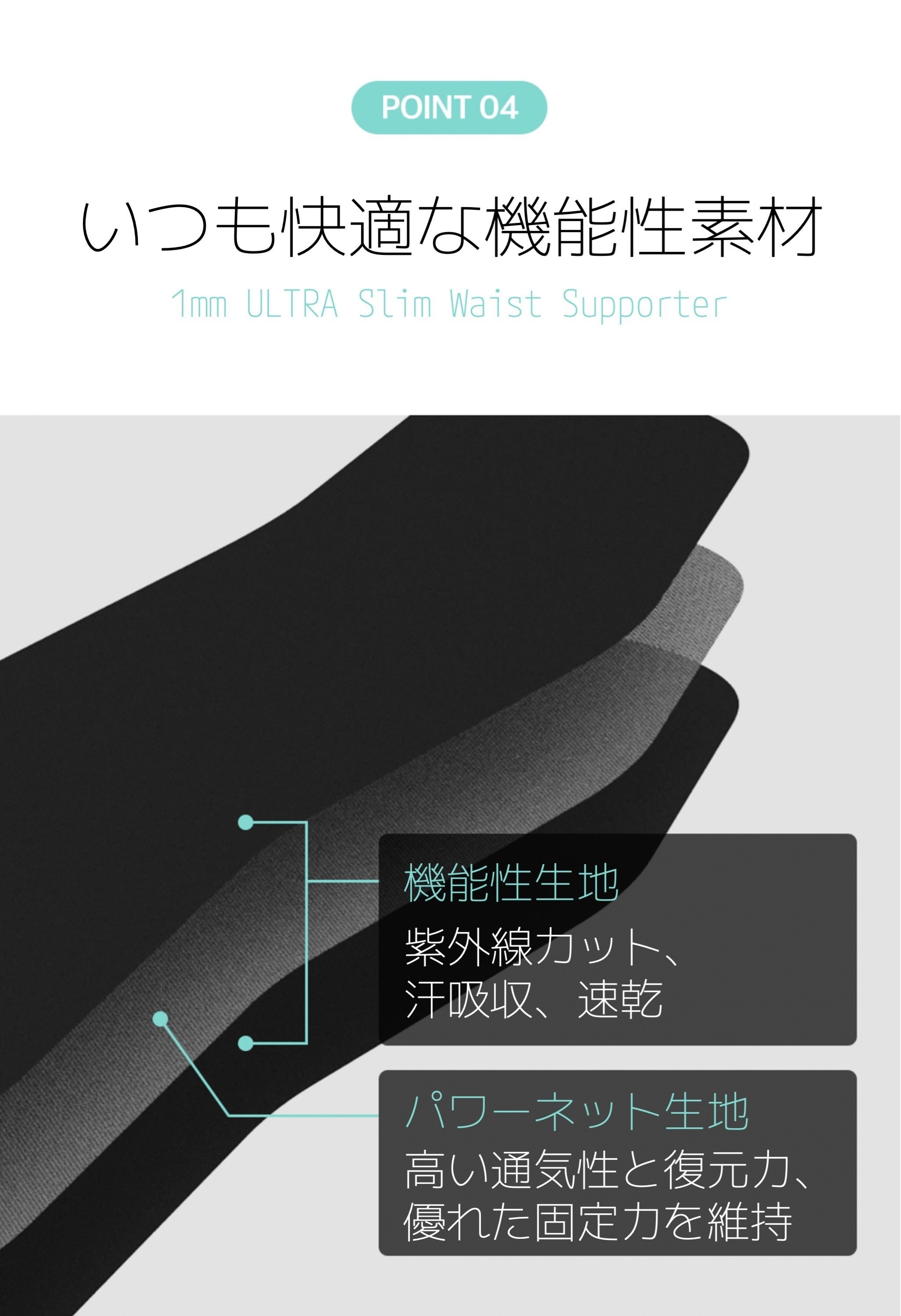 紫外線カット&吸汗・速乾性の機能性生地でパワーネット生地を包んだ、薄さと固定力を両立させる独自の素材構成。