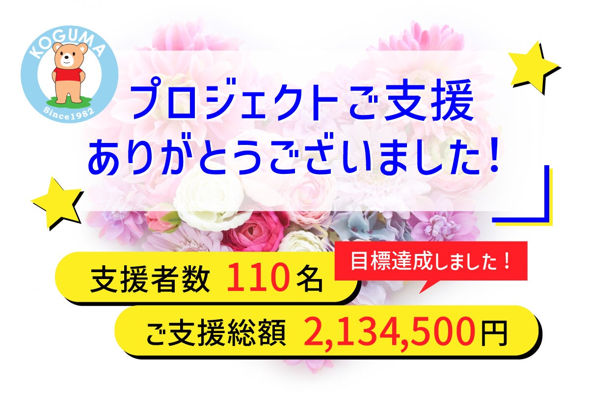 2024年5月30日より募集開始いたしましたこのプロジェクトも110名、総額2,134,500円ものご支援をいただき、皆様のおかげで目標を達成することができました。スタッフ一同、心より御礼を申し上げます。また皆様からの多くのご支援と温かいお言葉を頂き、日頃よりこぐま福祉会を気にかけていただき本当に感謝の気持ちでいっぱいです。皆様から寄せられたこのご支援は新しい遊具で、のびのびと遊ぶこどもたちの笑顔のために、大切に活用させていただきます。現在、新しい遊具の選定と導入準備を進めています。今後もこちらの活動報告より、随時ご報告させていただきます。また、お礼状の作成と領収書の準備を行っております。お届けは8月中を予定しております。いましばらくお待ちください。また次回のプロジェクトにつきましても準備を進めておりますのでこちらも詳細決まり次第、ご報告させていただきます。引き続き多くの皆様のプロジェクトへの賛同・ご支援を頂けますと幸いです。皆様の今後ますますのご健康とご発展を心からお祈りしております。