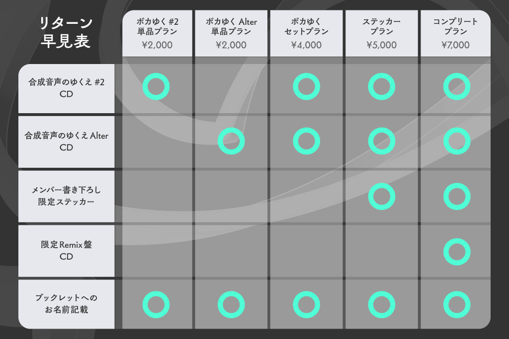 当プランは合成音声のゆくえ2,Alterの入手はできませんが、限定リターンとしてボカゆくを主催する駱駝法師・グミ山がそれぞれ所属する音楽グループ、Camelotsとキツネリの共作曲1曲をボーナストラックとしてお送りいたします!
