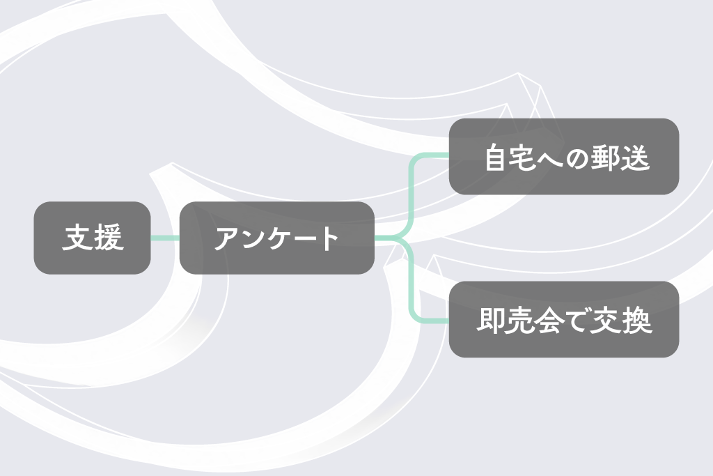 支援いただいた方には即売会現地で商品と交換できる電子チケットを発行し、遠方で来場できない方にも即売会後に郵送で商品をご送付いたします。