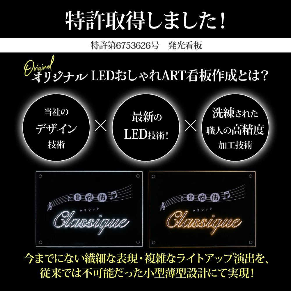 LEDおしゃれART看板は、特許取得の新技術でこれまでの悩みを解決し、看板として更なる力を発揮します。