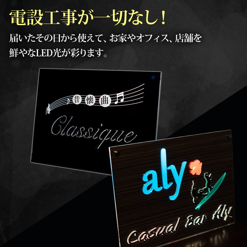 アクリルボードの表面を木目調にするなど、設置したい場所の雰囲気にあわせて変えることも可能。こだわりのLED看板・LEDサインボードに仕上げることができます。