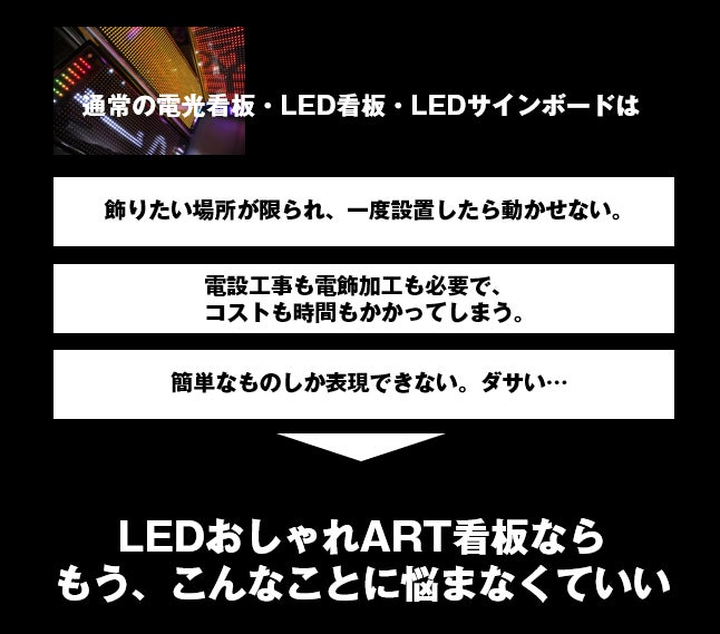 LEDおしゃれART看板は、特許取得の新技術でこれまでの悩みを解決し、看板として更なる力を発揮します。