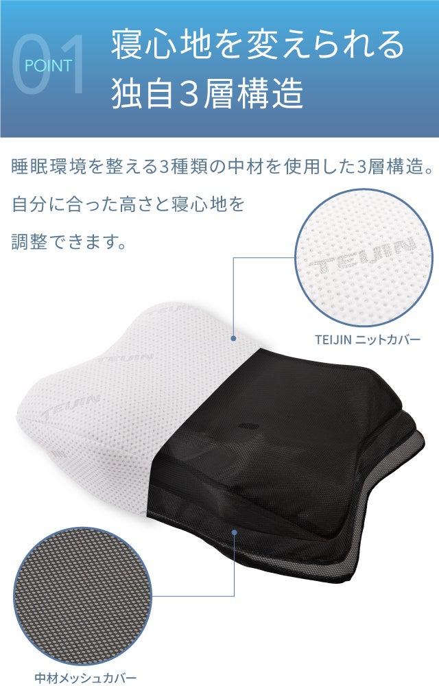 中材は、3層構造になっています。モールドウレタン(上層)モールドウレタン:調整シート(中層)に加え、下層部分に【帝人フロンティアの縦型構造不織布 AIRVERTICAL®】を贅沢に使っています。