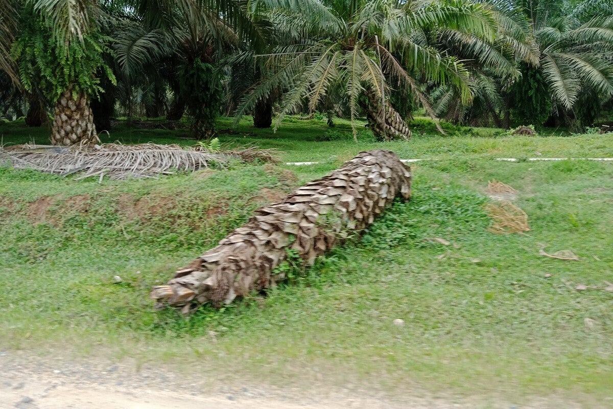 農園に放置された枯れたアブラヤシの木