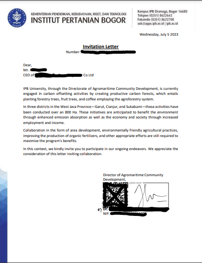 ボゴール農科大学より正式にINVITATIONレターが届きました。