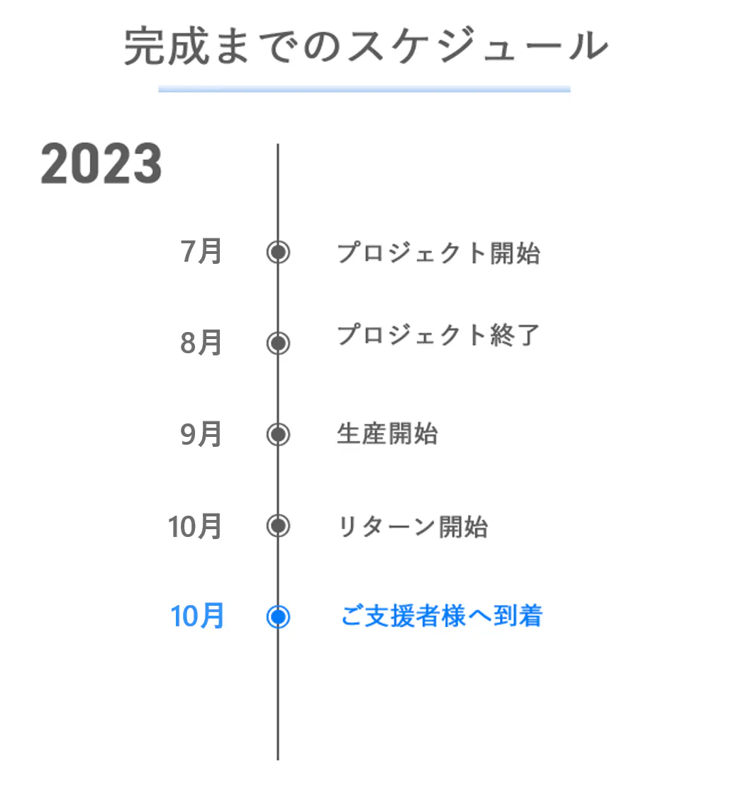 ※本文中に記載させていただいたスケジュールは、あくまでプロジェクト公開時点の予定です。クラウドファンディングの性質上、配送遅延のおそれがございます。