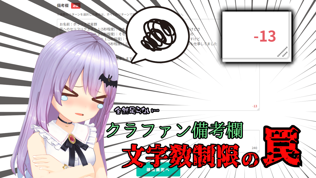 10,000円のプランから巴ちゃんかエルゼに短いセリフリクエスト2つをお願いできるリターンが付くんですけど、なんと!!!備考欄にも文字数制限さんがあって書けないことがあるみたいなんです…。