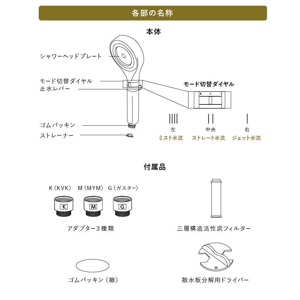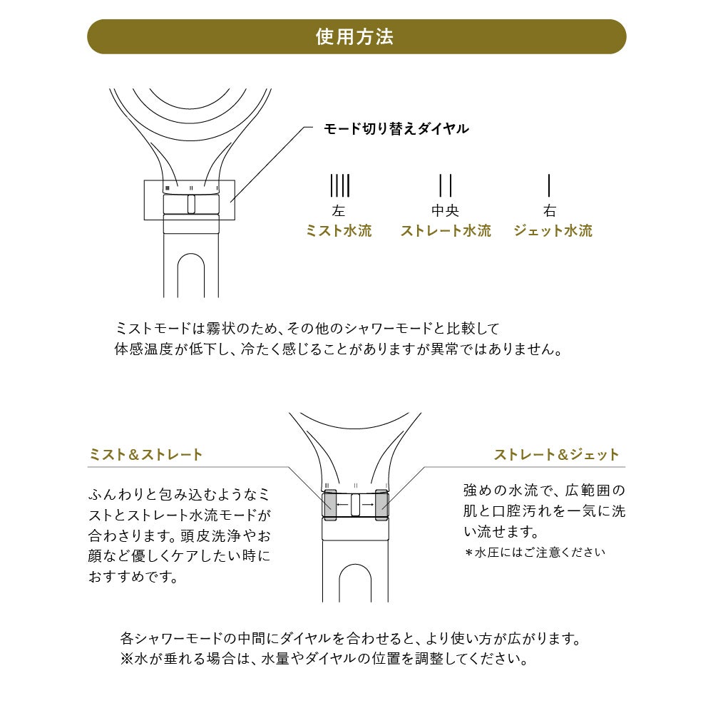 なお「ミストモード」は霧状のため、その他のシャワーモードと比較して体感温度が低下して感じることがありますが異常ではございません。お肌の仕上げなどにお使いください。