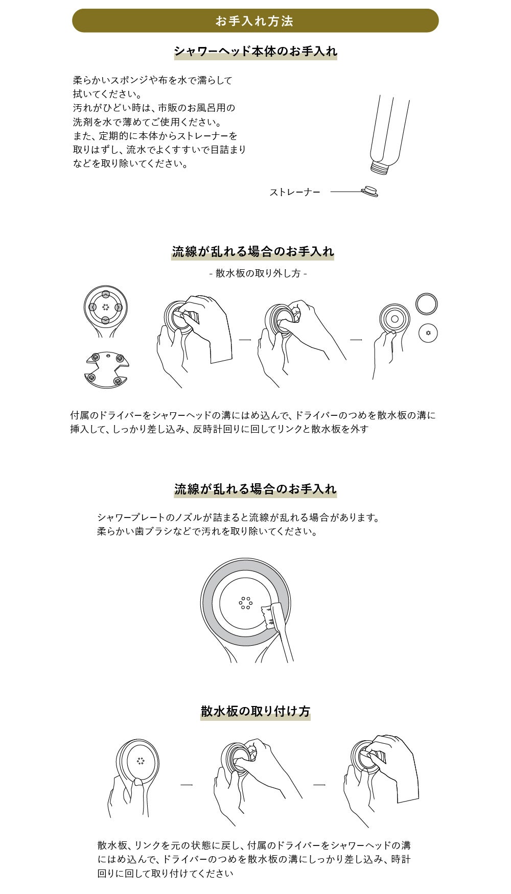 「ゆるみなく最後まで締まっているか」「シャワーが斜めに入っていないか」をご確認ください