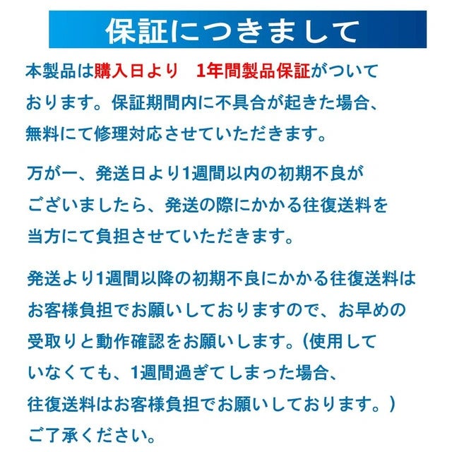 ・商品発送日より1年間の製品保証がついておりますので安心してお使いいただけます。