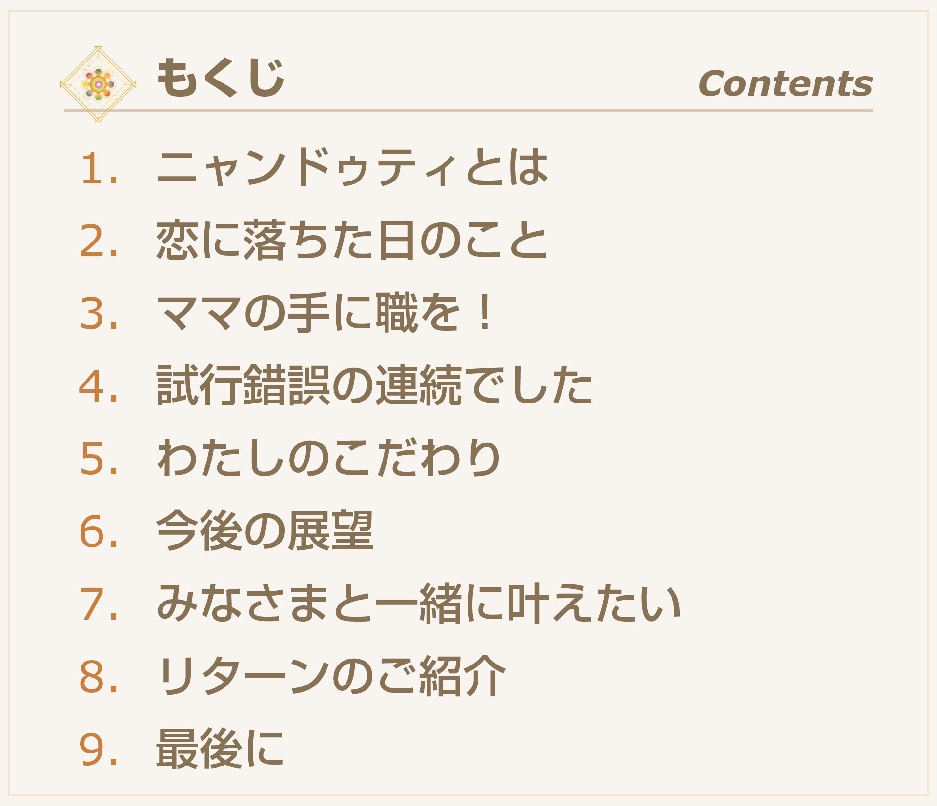 今もなおニャンドゥティに魅了され続けている、わたしが大切にしてきたこだわりをお伝えします。