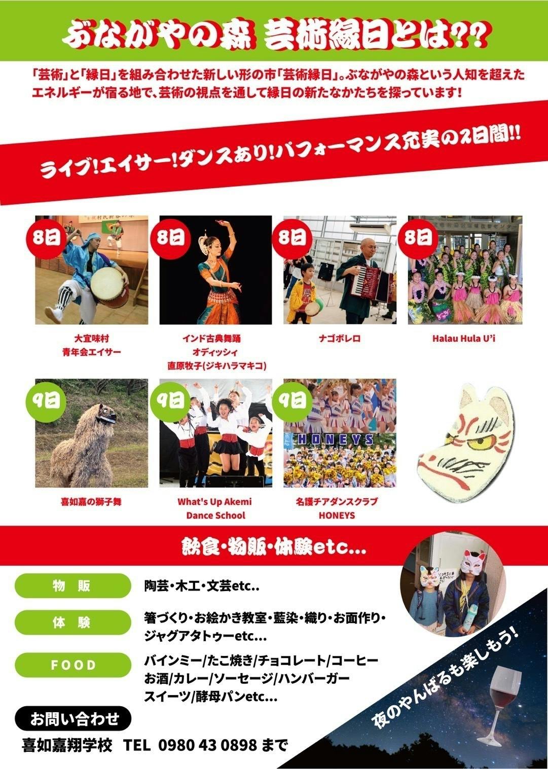 2024/11/21 22:33HONEN Fes!!!×芸術縁日のイベント内容がほぼ固まりました。ステージは、豊年祭の演目や琉球舞踊など伝統的な踊りのほか、豊年祭のそもそもの目的である自然への感謝としての神様への奉納の舞、大宜味村とうるま市出身で東京で活動しているファッションデザイナーのショー、はじめ微かな音から始まり次第にボリュームが上がり最後には最高潮に達する「ボレロ」をストリート的に演奏するナゴボレロ、急遽出演が決まった辺士名高校のダンス部、どこでも大人気の旧喜如嘉小学校の新しい伝統、獅子舞、そしてラストにはポップスと民謡で盛り上がって楽しく終えようという構成になっています。芸術に伝統をぶつけかきまぜ、若い世代が主体的に地域の未来をつくっていくきっかけの一つになるようスタッフ一同がんばっております。ぜひ会場に足をお運びください! もっと見る次回芸術縁日は12月7日 HONEN Fes!!!と共同開催