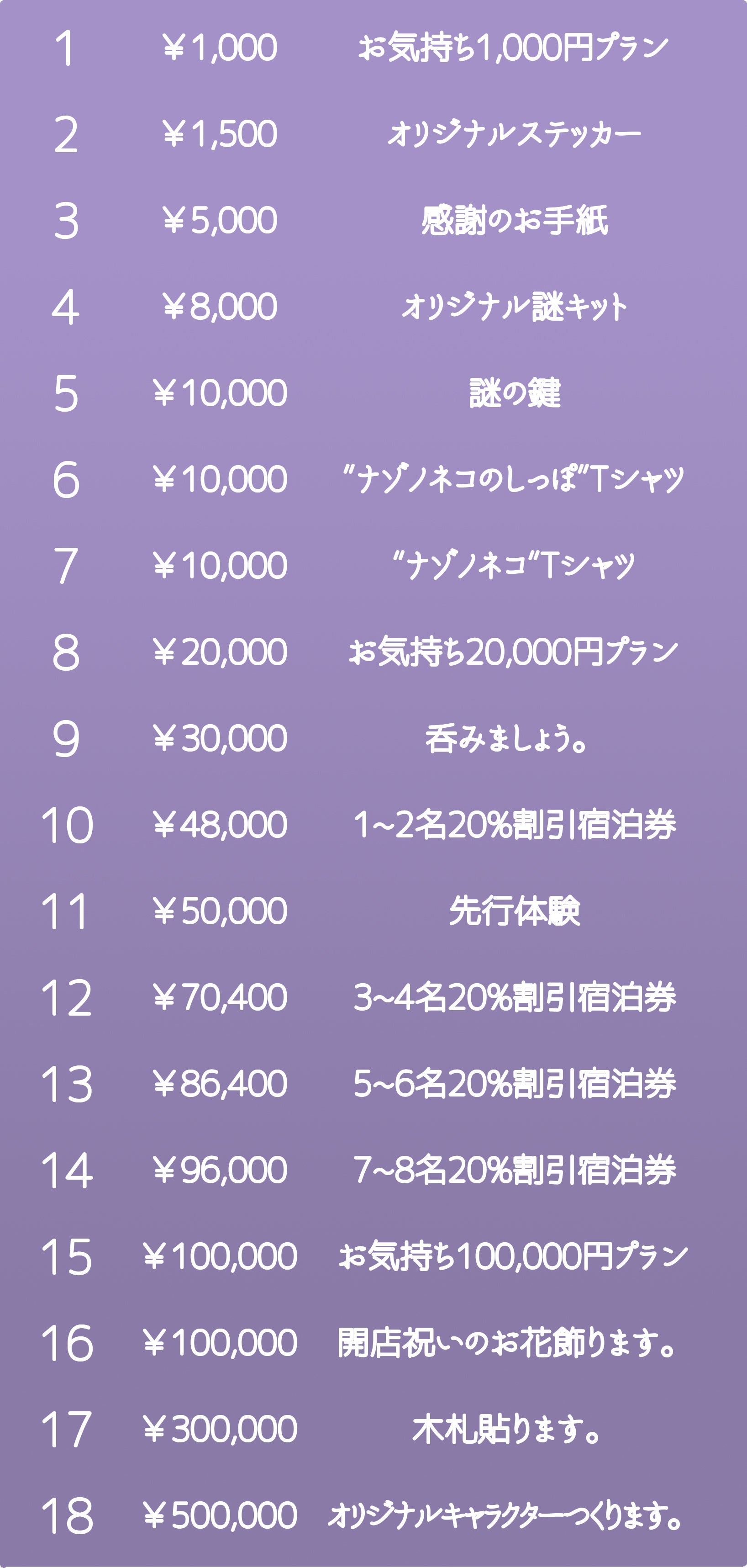 謎解き好きとしてとても興味を惹かれるプロジェクトです。 リターンの割引についてですが、10%引の方が20%引よりも使用期間が短いという理解でよろしかったでしょうか?(できれば10%の方も同じくらいの長さがあると嬉しいです💦)