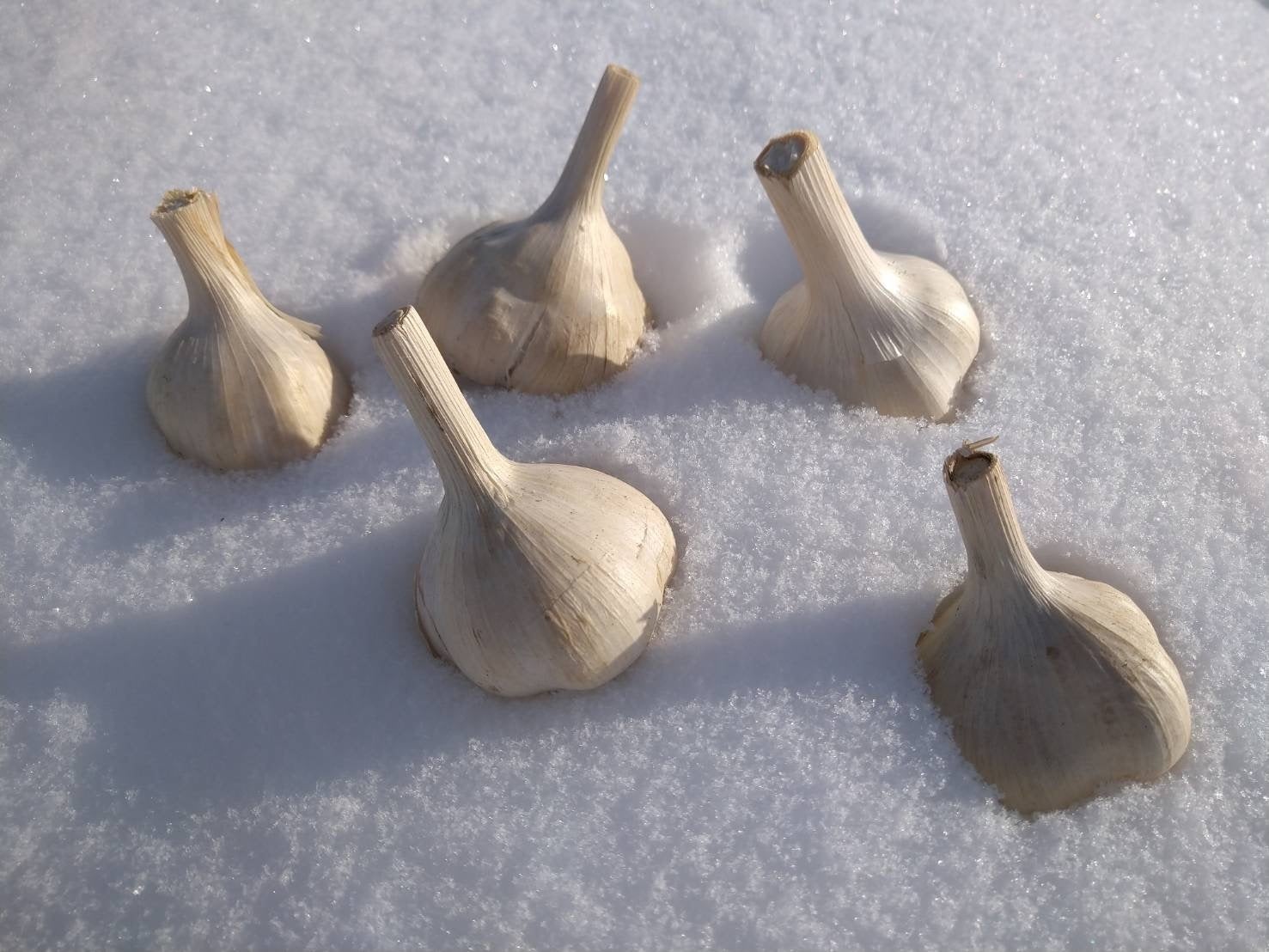 ダイヤモンドにんにくは秋に植え付けをし、新芽が出たころに冬が到来します。あっというまに畑は雪に覆われ、気温は氷点下へと。新芽のうちにこの過酷な寒さと雪のなか約半年間じーーーっとうまみと甘みを蓄えて育ちます。
