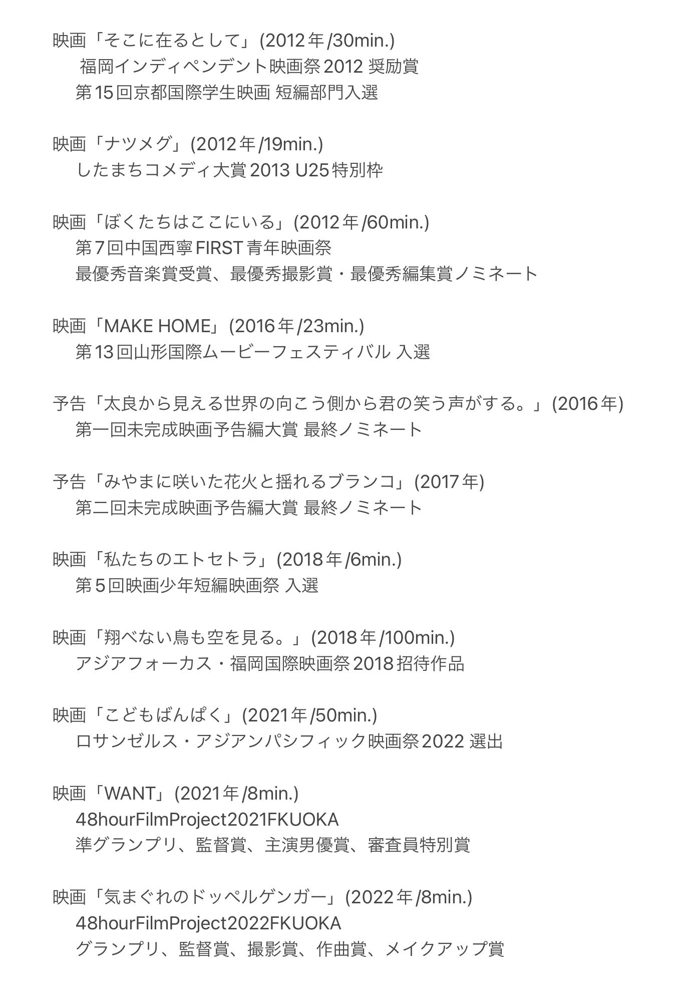 九州大学大学院卒。大学在学中より映画制作を開始。制作当初より、短編 を中心に、数多くの映画祭で入選・公式上映。中国の第 7回中国西寧FIRST 青年映画祭では、1004本中の10本に選出され、最優秀音楽賞受賞、最優 秀撮影賞・最優秀編集賞ノミネート。 2018年「翔べない鳥も空を見 る。」劇場公開。いじめ・SNSを題材にした同作は、福岡市内の中学校や 小学校で道徳教材としても上映される。気鋭の映画監督のひとりとして、今 後の活動が注目されている。 スマートフォンや、SNSなどのデジタルツールの作品への効果的な登用に定評がある。 芸能事務所で演技講師としても活動中。