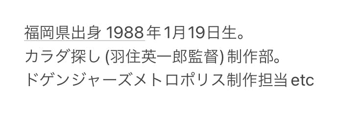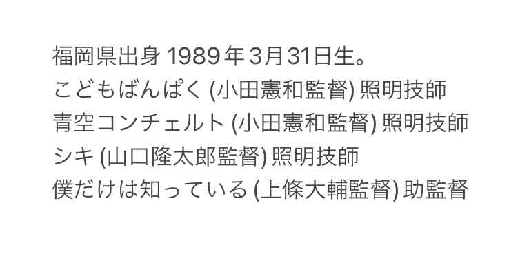福岡ビジュアルアーツ専門学校卒。福岡県内CM制作会社に就職。退社後、フリーランスの制作部・演出部を経て照明部に。