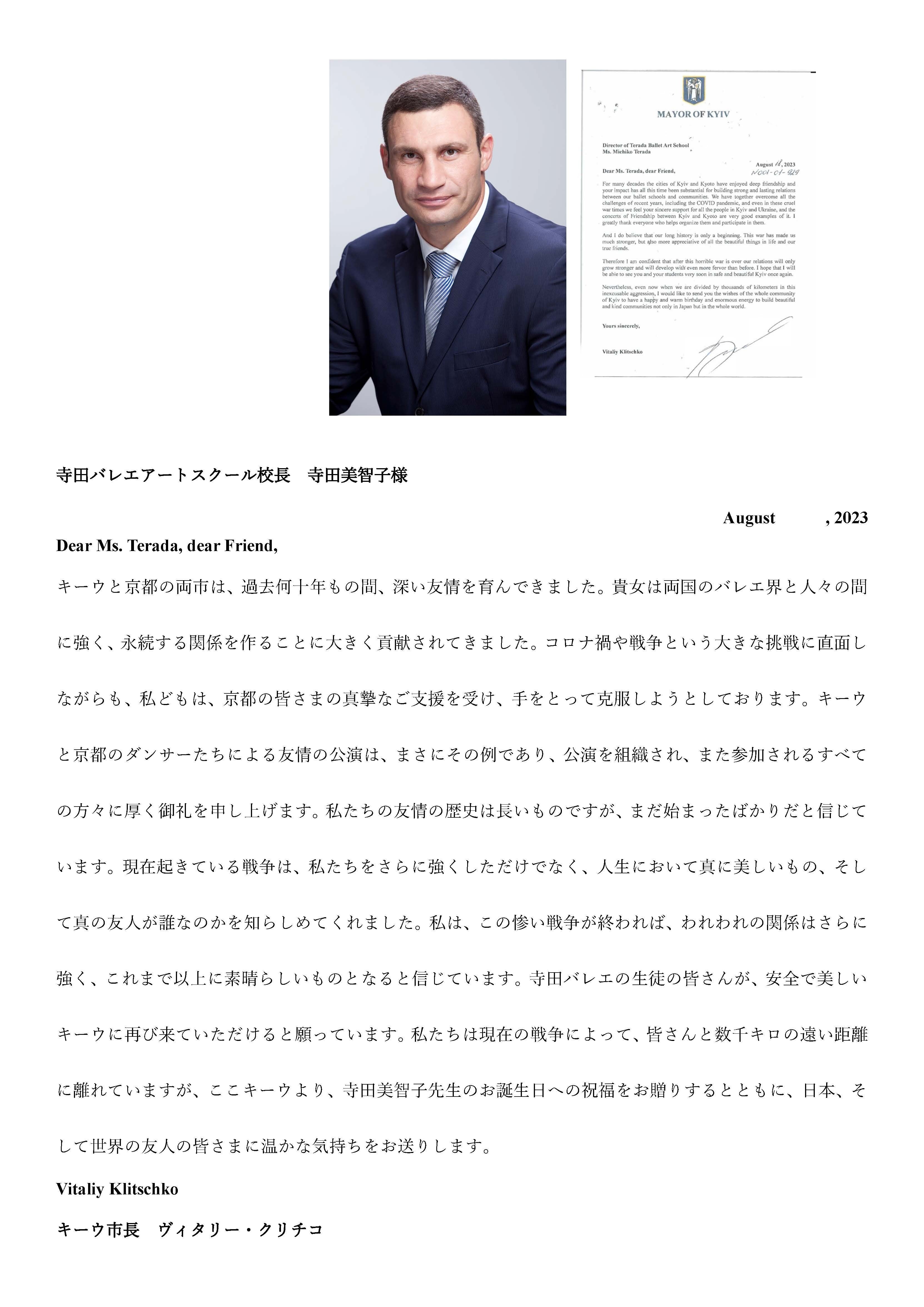 寺田バレエアートスクール校長 寺田美智子様August , 2023Dear Ms. Terada, dear Friend,キーウと京都の両市は、過去何十年もの間、深い友情を育んできました。貴女は両国のバレエ界と人々の間に強く、永続する関係を作ることに大きく貢献されてきました。コロナ禍や戦争という大きな挑戦に直面しながらも、私どもは、京都の皆さまの真摯なご支援を受け、手をとって克服しようとしております。キーウと京都のダンサーたちによる友情の公演は、まさにその例であり、公演を組織され、また参加されるすべての方々に厚く御礼を申し上げます。私たちの友情の歴史は長いものですが、まだ始まったばかりだと信じています。現在起きている戦争は、私たちをさらに強くしただけでなく、人生において真に美しいもの、そして真の友人が誰なのかを知らしめてくれました。私は、この惨い戦争が終われば、われわれの関係はさらに強く、これまで以上に素晴らしいものとなると信じています。寺田バレエの生徒の皆さんが、安全で美しいキーウに再び来ていただけると願っています。私たちは現在の戦争によって、皆さんと数千キロの遠い距離に離れていますが、ここキーウより、寺田美智子先生のお誕生日への祝福をお贈りするとともに、日本、そして世界の友人の皆さまに温かな気持ちをお送りします。Vitaliy Klitschkoキーウ市長 ヴィタリー・クリチコ