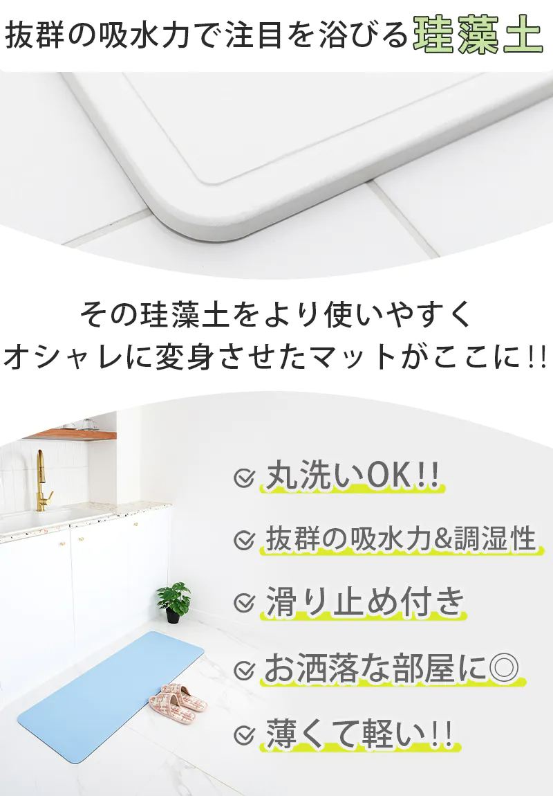 これらを補ったのが今回ご紹介する「洗える珪藻土マット&キッチンマット」