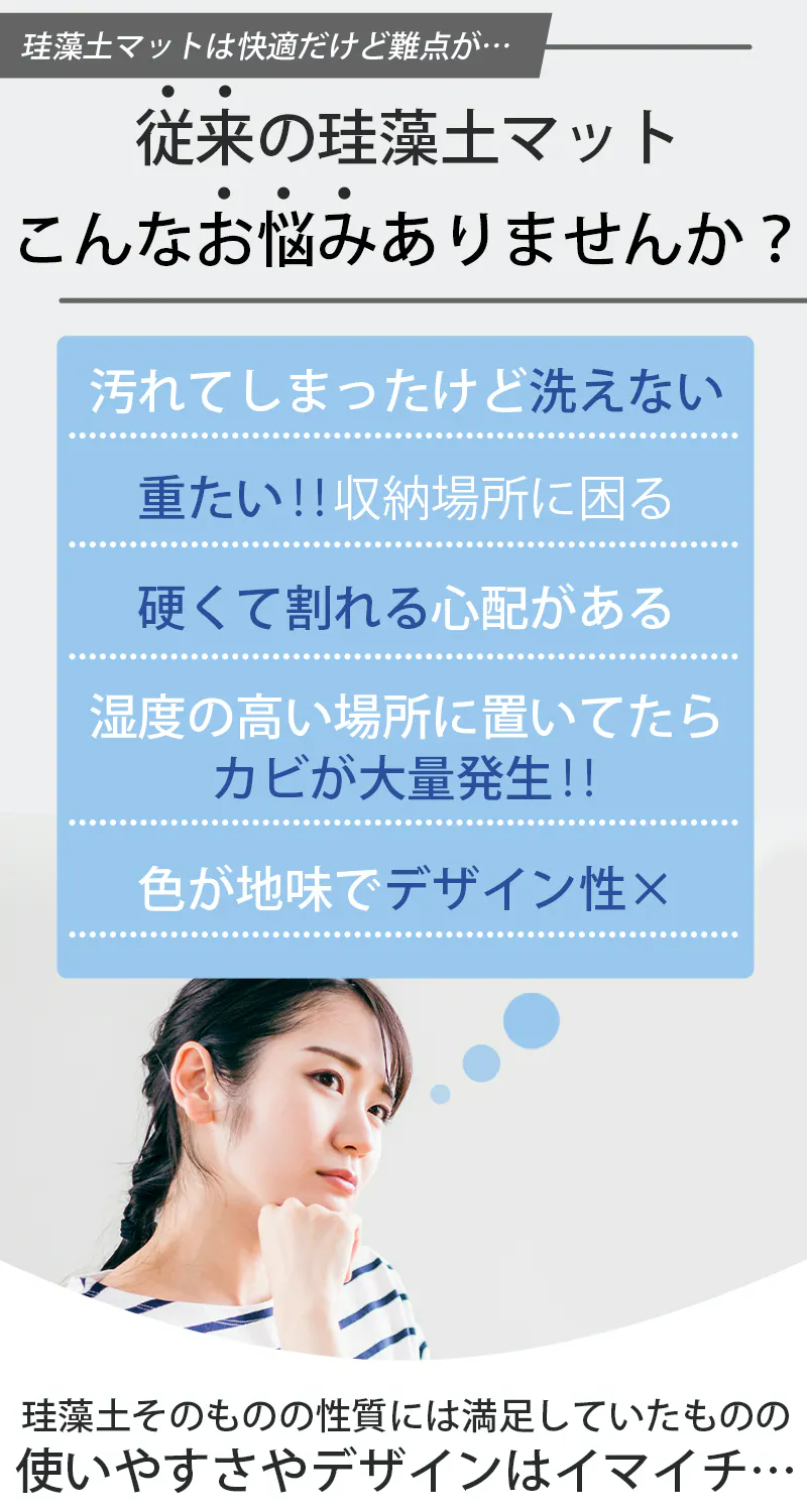 これにより従来の「重くて硬い」を解消し、薄くて軽い珪藻土マットを作り出すことができました。