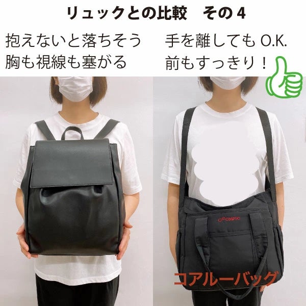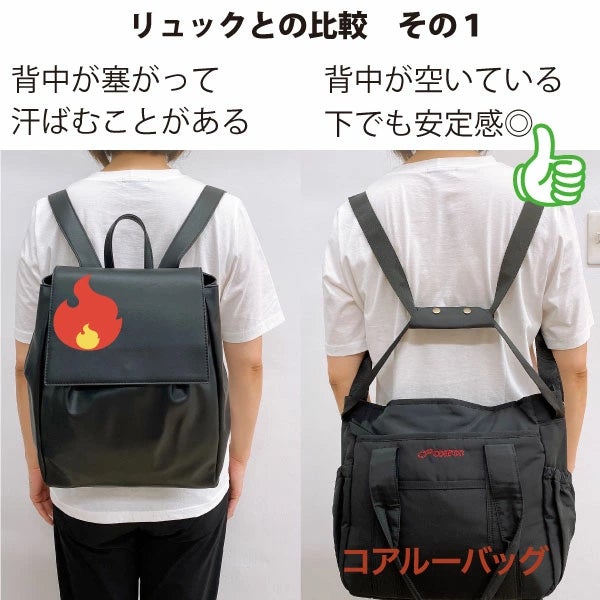 (右;一般的なリュック 左;コアルーバッグ「ニューマルシェ ブラック」使用)