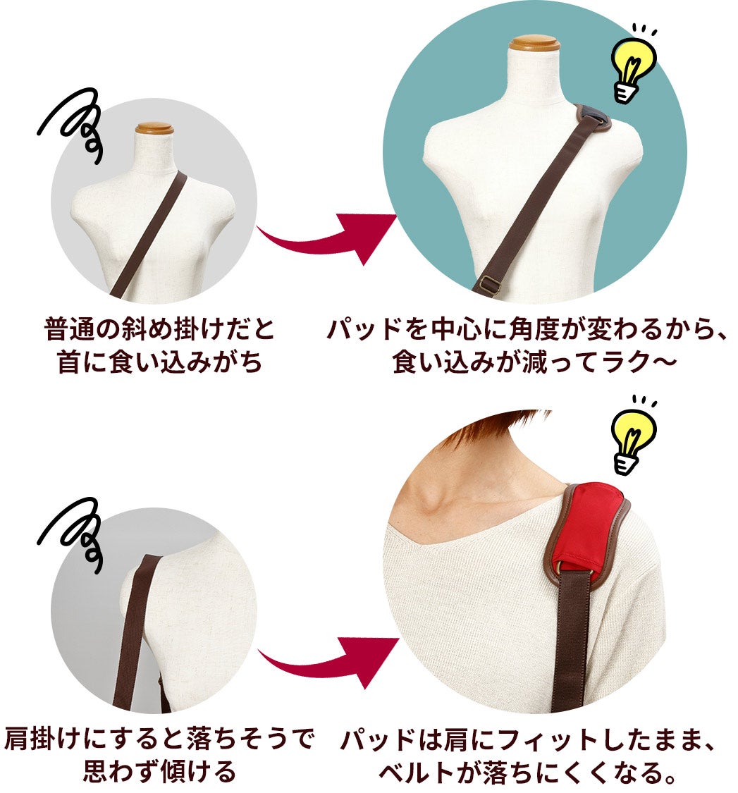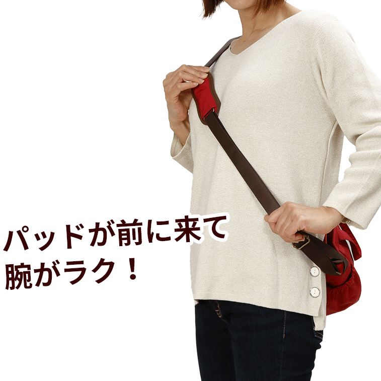 パッドはいつも真ん中に来るので、普通のショルダー掛けや斜め掛けにした際に、肩が非常にラクです。首に食い込むこともほとんど無くなり、カバンの重さで後ろから肩からずり落ちる心配も減ります。
