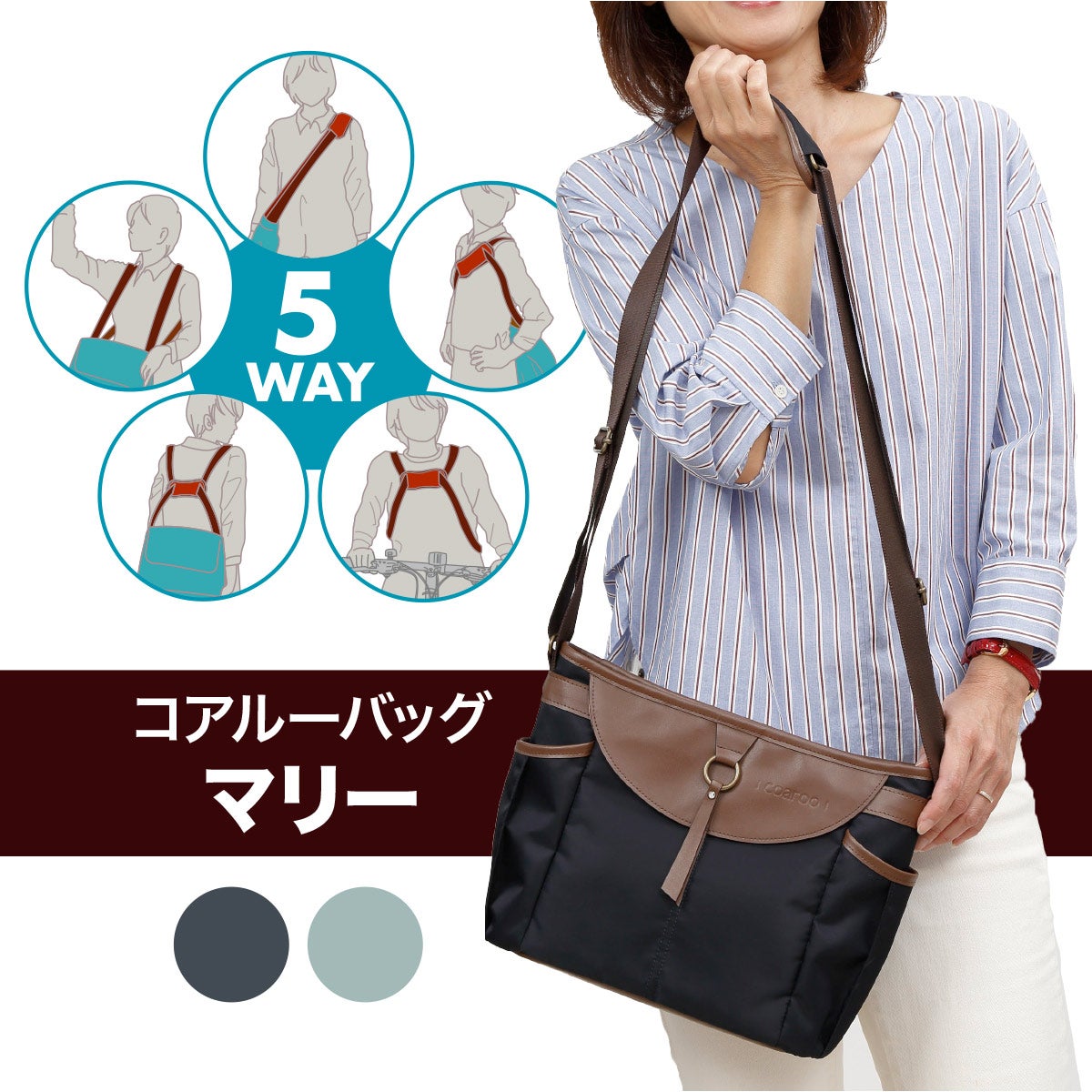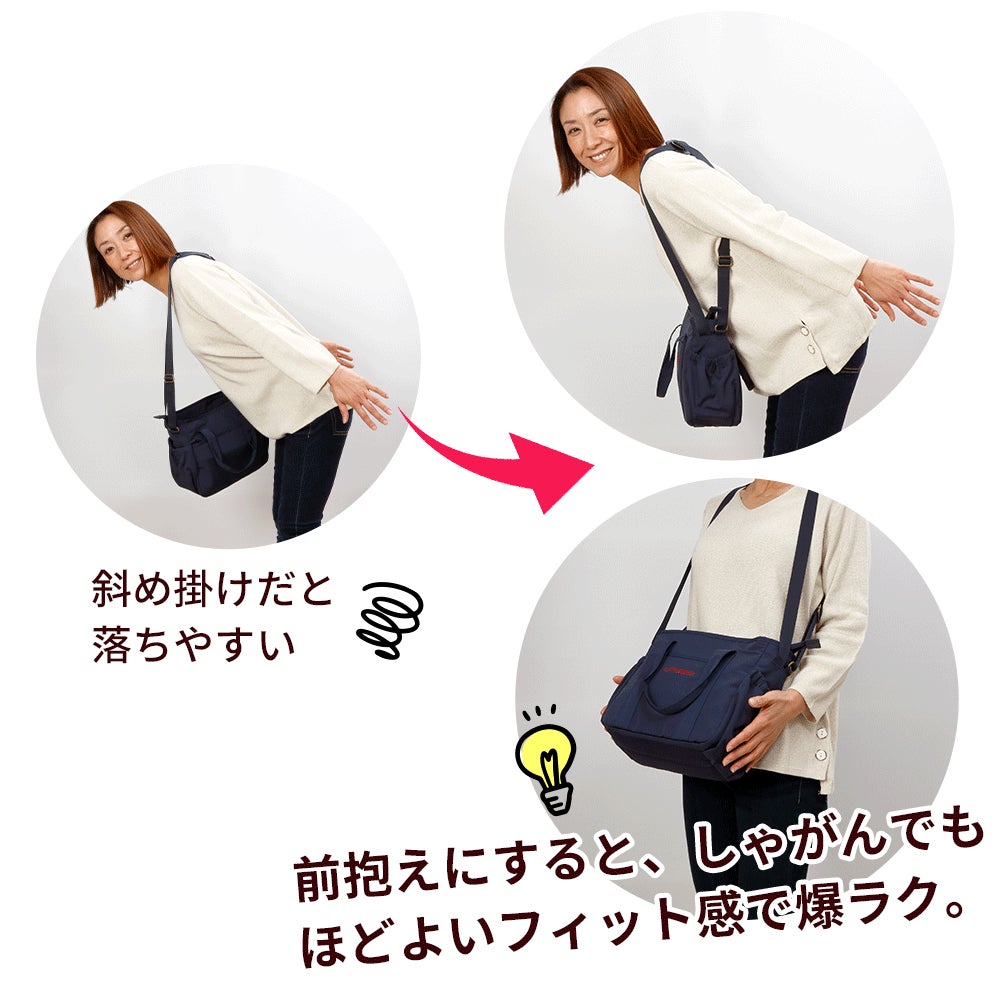 そして荷物から解放されたい休日には「マリー」をおススメします。小さめのバッグならリュックも前抱えも要らないのでは?と思いがちですが、なんとコアルーバッグを使い始めると、このバランスの取れたフィット感にハマり、「小さくてもコアルーでラクにしたい」とリクエストされる方が多いのです。エレガントなビジュアルも、平日とは異なる雰囲気を演出してくれます。親戚の集まりや保護者の集まりにもぴったりです。