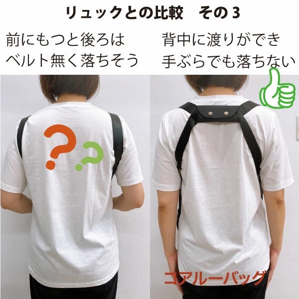 そもそもリュックを使う理由って、両手を空けたい、両肩に重さを分散して持ちたい…からです。でも暑くなると、背中に汗がこもって不快感が!! そこで提案ですが、5通りの掛け方で話題の「コアルーバッグ」のリュックスタイルなら、斜め掛けの延長で両肩に重さを分散しながら背中は空いたまま、つまり「背負わない」リュックになります。
