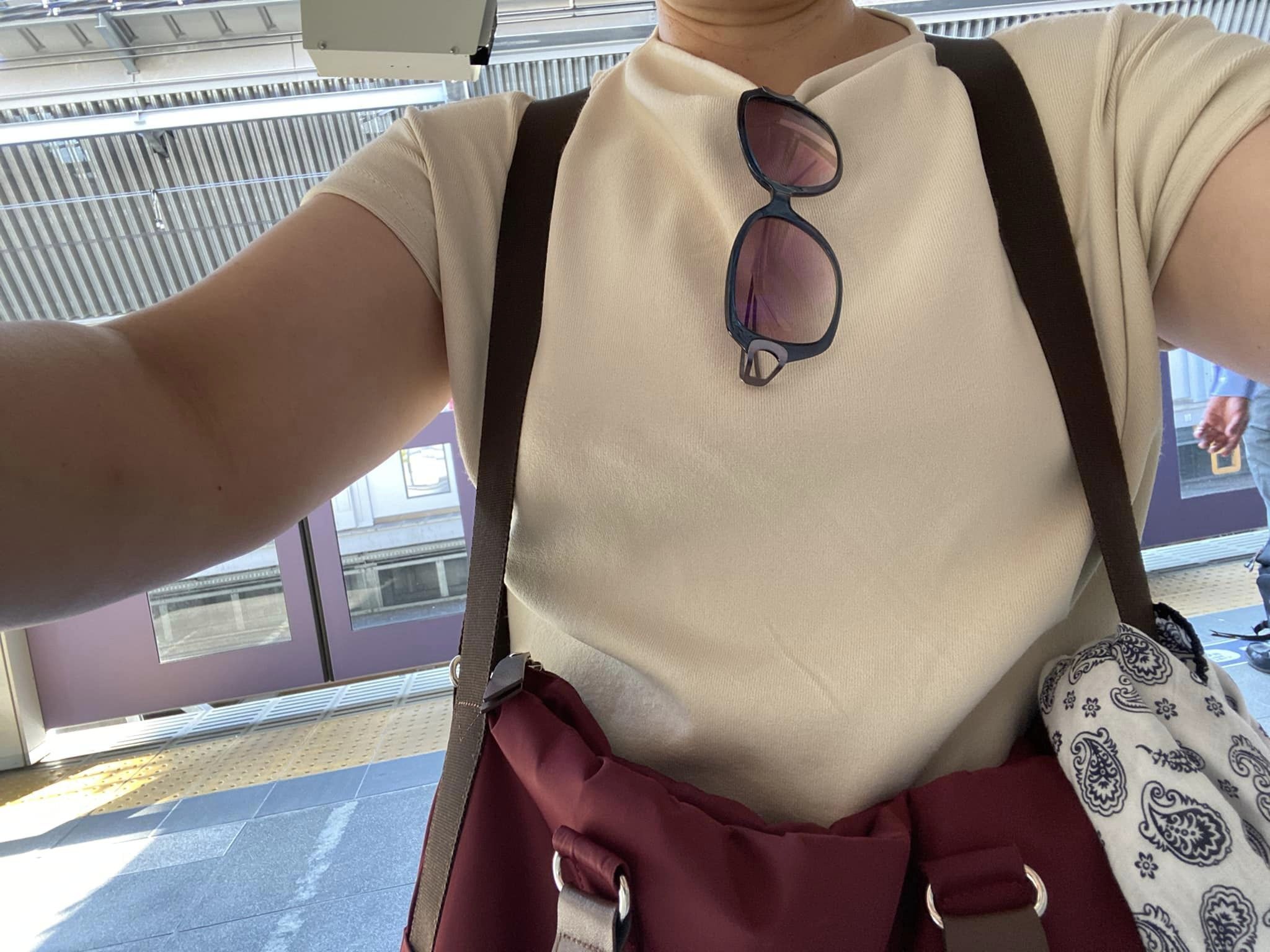 手ぬぐいも装着、サングラスを胸元に垂らしてもぶつからず(リュックだとこうは行かない)、ケイタイ片手に改札を通るスピードもピカイチです。