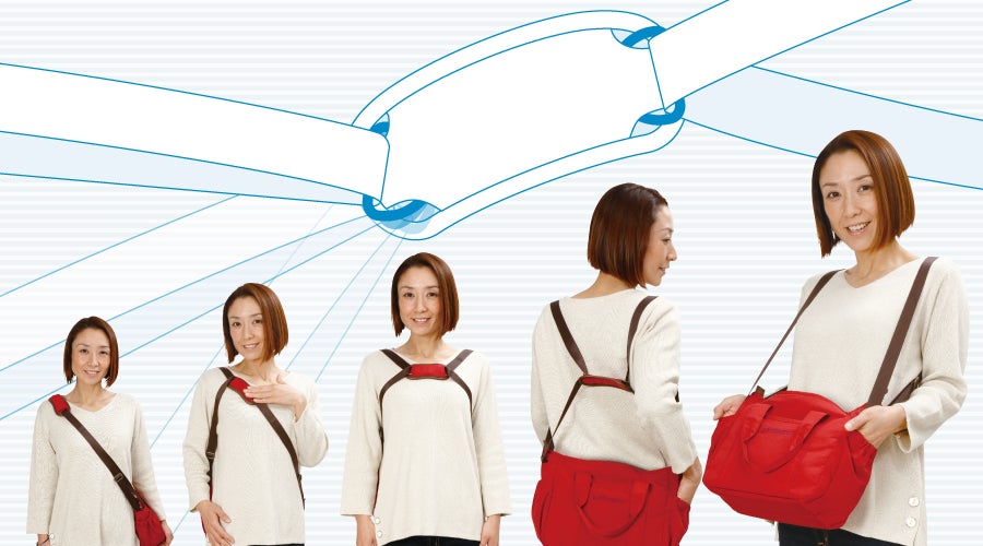 コアルーは、パッドを中心に左右のベルトが二重になっていて、実に自由自在に掛け方を変えられる、シンプルかつマルチな革新的な構造です。荷物が重い時、仕事に子育てに、旅行に、もちろん普段使いにも便利です。その時々の状況に合わせて最適な掛け方でお使いいただけます。