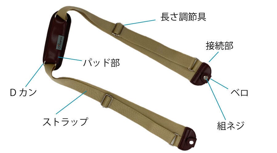 【材質】 ストラップ部;ポリプロピレン、接続部・パッド部;人工皮革(合成皮革ではありません)、金具;ニッケルシルバー