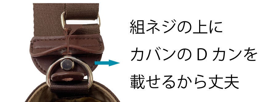 ベロと2枚の接続部のうち上の半円型の革部を外して、カバンのDカンを組ネジに載せます。そして元の形に戻すように閉めます。(下の画像では試作品を使用しております)