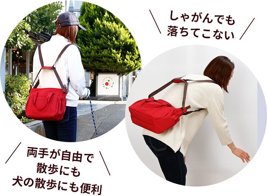 そして、以外にもいろいろなピンチを助けてくれます。傘を差すと濡れにくい場所で、エコバッグやリュックをさらに掛けてもぶつからない場所! 特に杖を使う方におススメの安定感があります。杖を使うと片手または両手がふさがるし、その時にリュックだとかえって不便だったり、通常の斜め掛けだと重さが偏るし揺れで安定感がとりにくいためです。