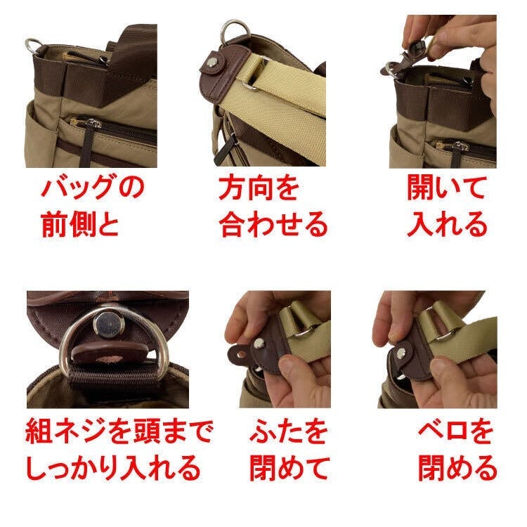 付け方はこのようにあります。長さの調節具が付いているストラップがカバンの背面にくるように方向を合わせてください。反対でも使えますが、5通りの掛け方に変身する時にスムーズになるのでおススメです。
